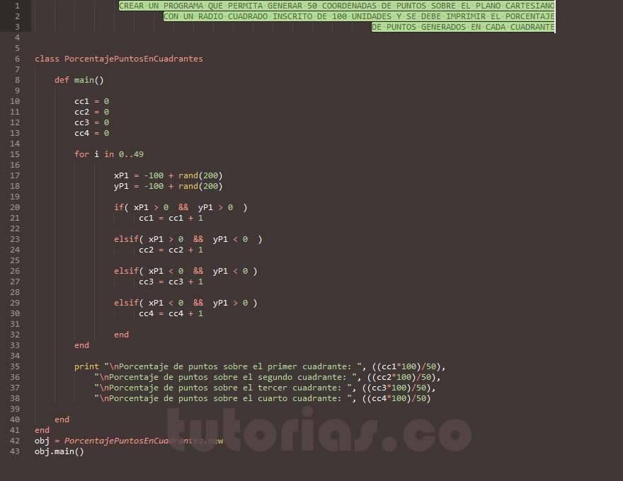 La lógica que utiliza este programa en ruby es simple. Se crea la iteración en el ciclo de 1 a 50 generando los puntos aleatorios y a través de sentencias condicionales determinar cual es el cuadrante para incrementar el contador respectivo. Se programo usando POO.